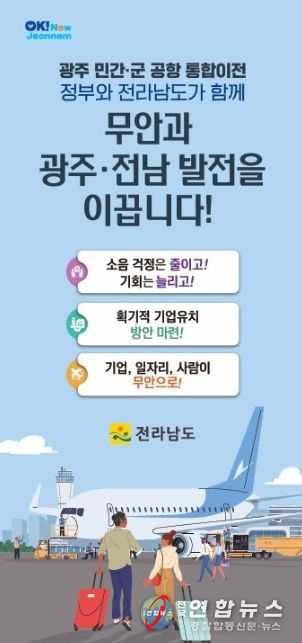 전국연합뉴스 김철환 기자 | 전라남도는 전남·광주·무안의 상생과 도민의 오랜 염원을 이루기 위해 광주 민간·군 공항의 무안국제공항 통합이전을 ‘더 이상 미룰 수 없는 시대적 과제’로 규정하고 강력히 추진할 계획이라고 밝혔다.
