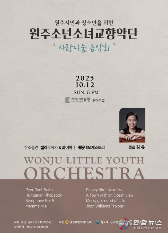 전국연합뉴스 유근택 기자 | 원주소년소녀교향악단은 오는 12일 오후 5시, 치악예술관에서 ‘사랑나눔음악회’를 통해 지역사회와 함께하는 따뜻한 무대를 마련한다.
