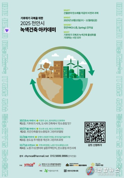 전국연합뉴스 김대환 기자 | 오는 10월15일 저녁 7시부터 총 4회에 걸쳐 강좌와 탐방 등으로 구성된 2025 천안시 녹색건축 아카데미가 개최된다.