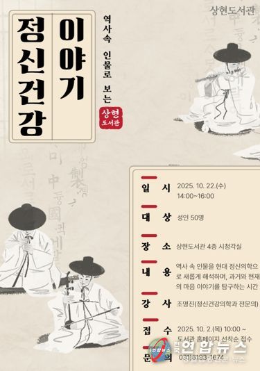 전국연합뉴스 박남호 기자 | 용인시 상현도서관은 오는 22일 오후 2시 ‘정신건강의 날’을 기념해 시민 대상 공개강좌 ‘역사 속 인물로 보는 정신건강 이야기’를 개최한다.