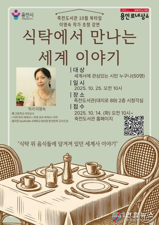 전국연합뉴스 박남호 기자 | 용인특례시는 25일 오전 10시 죽전도서관 시청각실에서 죽전도서관 북타임 작가초청강연회 ‘식탁에서 만나는 세계 이야기’를 연다고 13일 밝혔다.