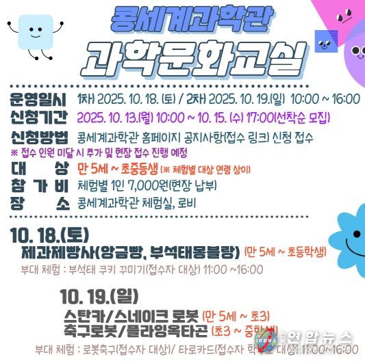 최수영 기술지원과장은 “과학문화교실을 통해 아이들이 과학에 흥미를 느끼고, 자신의 적성에 맞는 진로를 탐색하는 계기가 되길 바란다”며 “많은 어린이와 청소년의 참여를 기대한다”고 말했다.