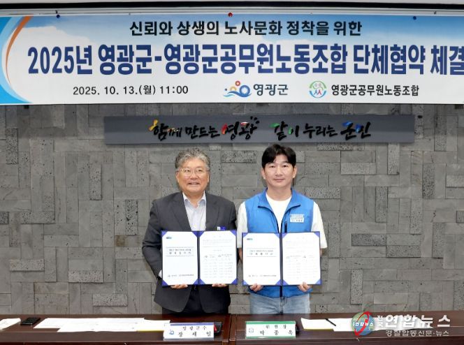 전국연합뉴스 김철환 기자 | 영광군은 지난 10월 13일 군청 2층 소회의실에서 영광군공무원노동조합과 “2025년 단체협약식”을 체결했다.