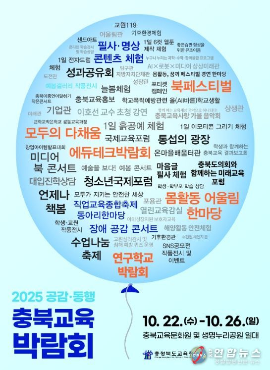 전국연합뉴스 기자 | 충청북도교육청은 오는 22일부터 26일까지 5일간 '17만의 숨결, 꿈결 바람결'이라는 슬로건 아래 충북교육의 현재를 공유하고 미래 교육의 방향을 체험하는 통합형 교육박람회인 2025 공감‧동행 충북교육박람회를 개최한다고 밝혔다.