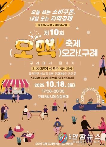 전국연합뉴스 김철환 기자 | 전남 구례군은 오는 10월 18일 오후 5시부터 8시까지 구례읍 5일시장 상설무대 일원에서 '제10회 오맥축제 오라! 구례, 구례에서 즐기자'를 개최한다고 밝혔다.