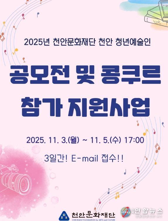 전국연합뉴스 김대환 기자 | 천안문화재단은 내달 3~ 5일까지 ‘천안 청년예술인 공모전 및 콩쿠르 참가 지원사업’ 참여자를 모집한다고 15일 밝혔다.