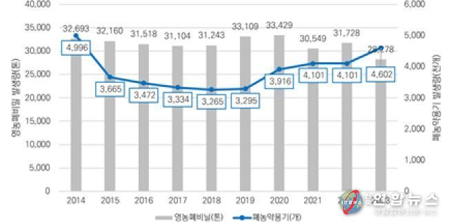 2023년 기준 경기도 영농폐기물 발생량은 영농 폐비닐이 약 3만 톤(93%), 폐농약 용기가 약 460만 개(94%)로 나타났다.
