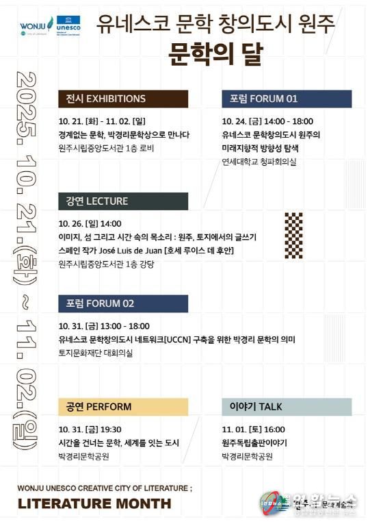 전국연합뉴스 유근택 기자 | ‘유네스코 문학 창의도시 원주’가 오는 10월 21일부터 11월 2일까지 ‘시간을 건너는 문학, 세계를 잇는 도시’를 기치로'2025년 원주 문학의 달'행사를 개최한다.