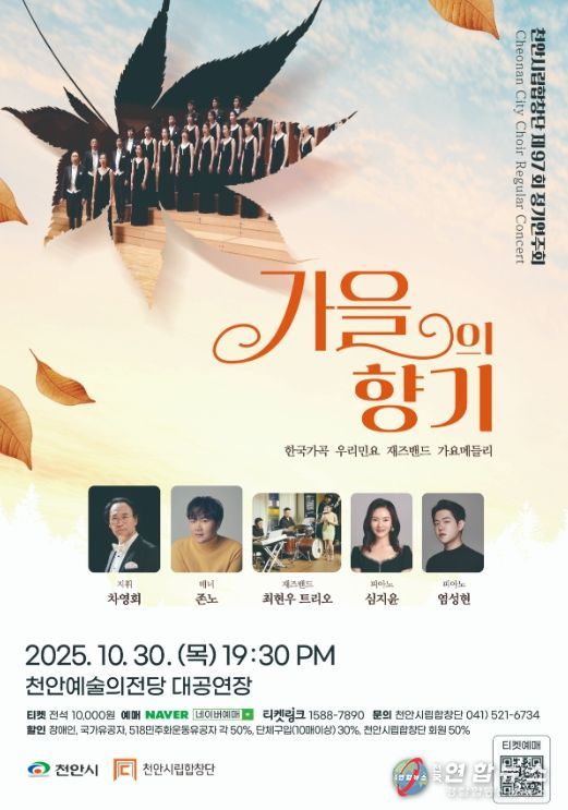 전국연합뉴스 김대환 기자 | 천안시립합창단이 오는 30일 오후 7시 30분 천안예술의전당 대공연장에서 제97회 정기연주회 ‘가을의 향기’를 개최한다.