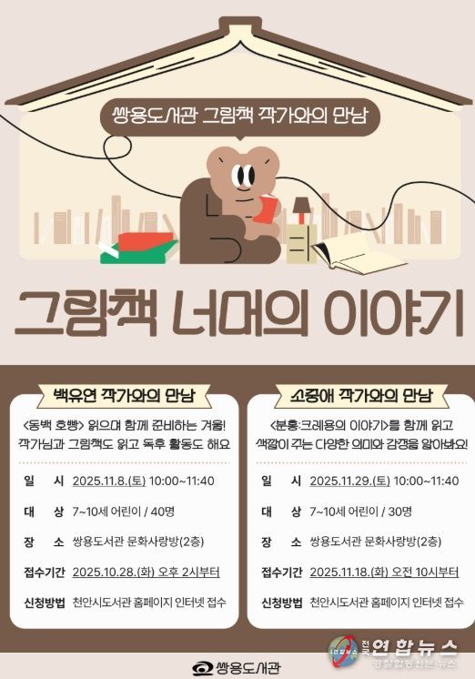 전국연합뉴스 김대환 기자 | 천안시 쌍용도서관은 내달 어린이들을 위한 작가 초청 프로그램 ‘그림책 너머의 이야기’를 운영한다고 17일 밝혔다.