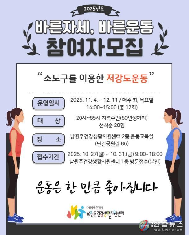 전국연합뉴스 유근택 기자 | 남원주건강생활지원센터는 다음 달 4일부터 지역 주민을 대상으로 건강생활실천 프로그램 ‘바른자세, 바른운동’을 운영한다.