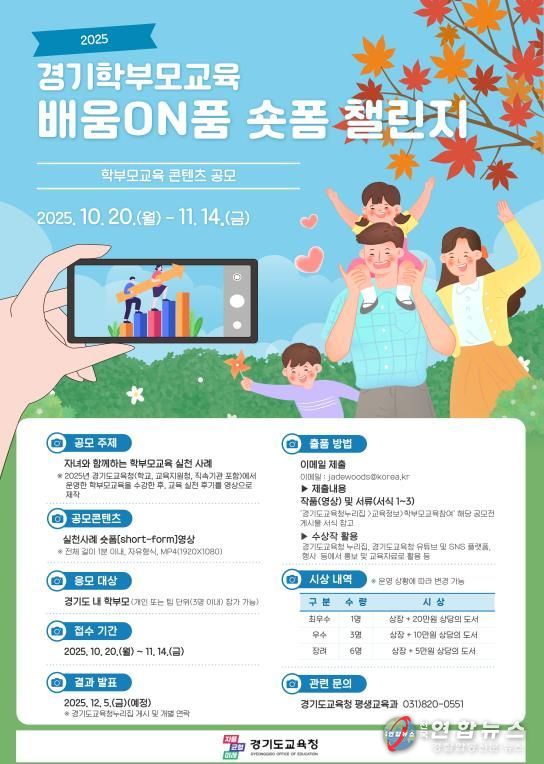 전국연합뉴스 기자 | 경기도교육청이 학부모의 교육 참여문화 확산과 가정의 배움 문화 조성을 위한 ‘2025 경기학부모교육 콘텐츠 공모전(배움 온(ON)품 숏폼 챌린지)’을 개최한다.