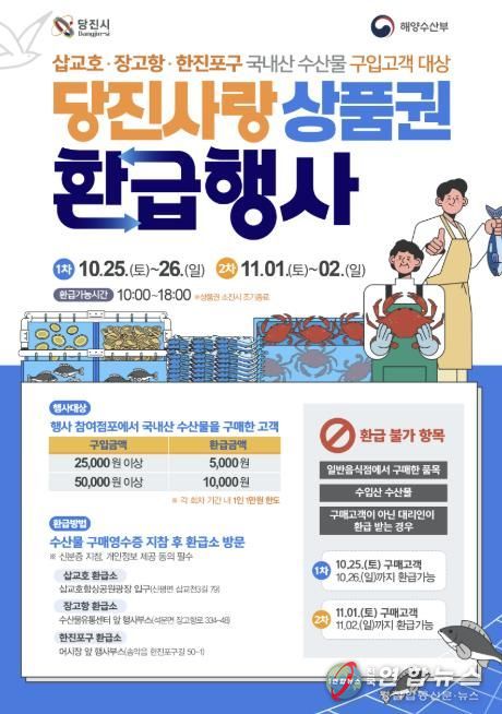 전국연합뉴스 김용태 기자 | 당진시는 가을철을 맞아 오는 10월 25일과 26일 이틀간 국내산 수산물을 구매한 고객에게 최대 20%를 당진사랑상품권으로 환급하는 행사를 진행한다고 22일 밝혔다.