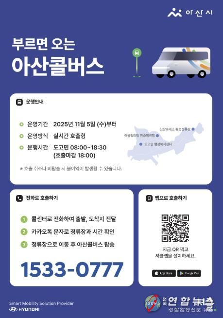 전국연합뉴스 김용태 기자 | 아산시가 도고면 지역의 관광 활성화와 주민들의 이동 편의성 제고를 위해 오는 11월 5일부터 수요응답형 공공형 버스(DRT) ‘아산콜버스’를 시범 운행한다.