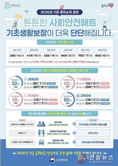 2026년부터는 청년 근로·사업소득 공제 적용 연령은 만 34세 이하로 확대되고, 소득 기본 공제액은 60만 원으로 늘어난다. 이와 함께 차량가액 500만 원 미만의 소형 승합·화물자동차는 일반재산 소득환산율(4.17%)이 적용돼 재산 기준 부담이 완화된다.