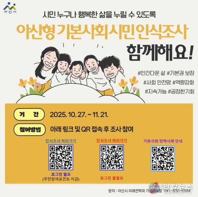 전국연합뉴스 김용태 기자 | 아산시가 ‘아산형 기본사회 구현을 위한 시민 인식 조사’를 오는 10월 27일부터 11월 21일까지 실시한다.