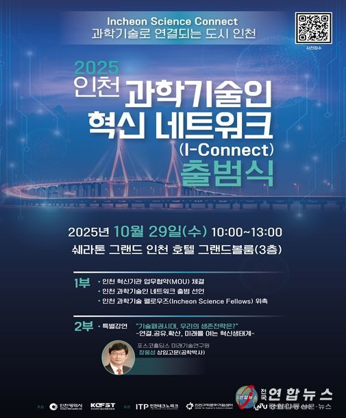 전국연합뉴스 원영호 기자 | 인천광역시는 10월 29일 쉐라톤 그랜드 볼룸에서 ‘인천 과학기술인 혁신 네트워크(i-connect)’출범식을 개최하고, 지역 과학기술 주체 간 협력기반 강화를 위한 본격적인 행보에 나섰다고 밝혔다.