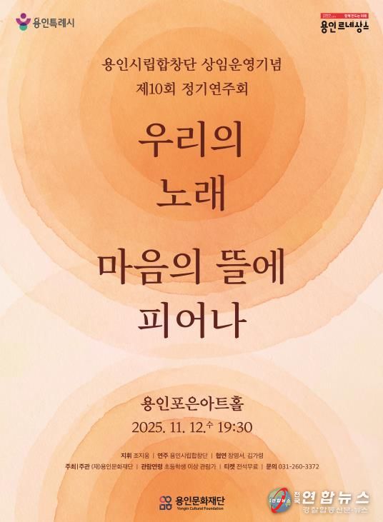 전국연합뉴스 박남호 기자 | (재)용인문화재단은 오는 11월 12일 오후 7시 30분, 용인포은아트홀에서 용인시립합창단 상임 운영기념 ‘제10회 정기연주회’'우리의 노래, 마음의 뜰에 피어나'를 개최한다.