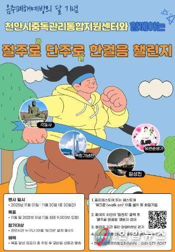 성준모 천안시중독관리통합지원센터장은 “시민들이 건강한 걷기 문화를 통해 자연스럽게 절주를 실천할 수 있도록 설계된 캠페인”이라며 “중독의 위험성을 인식하고, 건전한 생활습관으로 이어가는 계기가 되길 바란다”고 말했다.