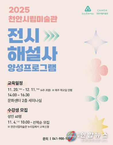 전국연합뉴스 김대환 기자 | 천안문화재단은 내달 4일부터 ‘2025 전시해설사 양성프로그램’ 참여자를 선착순 모집한다고 31일 밝혔다.