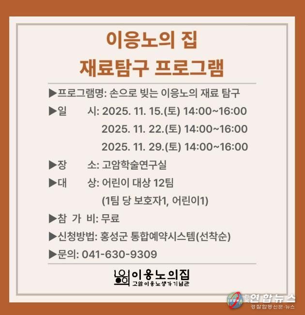 전국연합뉴스 김용태 기자 | 홍성군 고암이응노생가기념관은 오는 15일, 22일, 29일(매주 토요일) 오후 2시부터 4시까지 ‘재료탐구 프로그램’을 운영한다고 밝혔다.