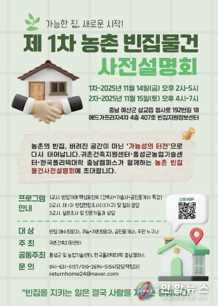 전국연합뉴스 김용태 기자 | 홍성군은 오는 14일과 15일 양일간 귀농·귀촌을 희망하는 도시민과 지역 주민에게 실질적인 주거 정보를 제공하고, 방치된 농촌 빈집에 새 생명을 불어넣기 위한 사전 설명회를 개최한다.