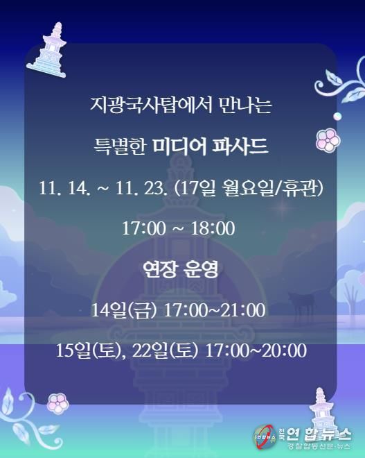 미디어파사드 전시는 11월 14일부터 23일까지 운영되며, 관람 시간은 오후 5시부터 6시까지다. 단, 17일은 휴관하며, 14일은 오후 9시까지, 15일과 22일은 오후 8시까지 연장 운영한다.
