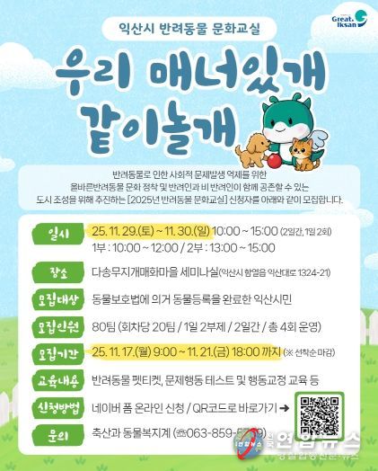 전국연합뉴스 최성용 기자 | 익산시가 올바른 반려동물 문화 확산을 위한 교육의 장을 연다.