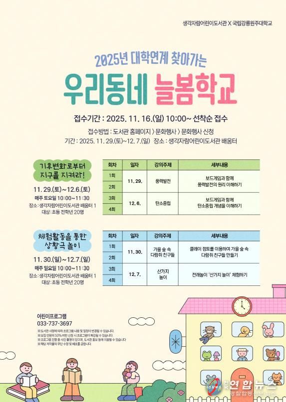 전국연합뉴스 유근택 기자 | 원주시 생각자람어린이도서관은 초등학생 전 학년을 대상으로 ‘대학연계 찾아가는 우리동네 늘봄학교 프로그램’을 운영한다.