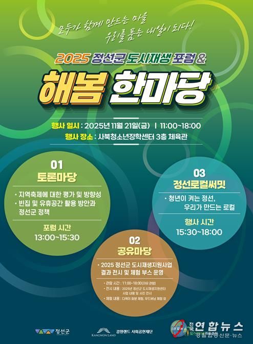 전국연합뉴스 신승국 기자 | 정선군도시재생지원센터는 오는 2025년 11월 21일 사북청소년장학센터에서 '2025 도시재생포럼 및 해봄한마당'를 개최한다고 밝혔다.