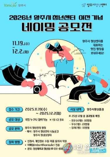 전국연합뉴스 박점규 기자 | 양주시가 2026년 청년센터 이전과 확대 운영을 앞두고 새 보금자리의 브랜드 정체성을 시민과 함께 만들기 위해 ‘양주시 청년센터 이전 기념 네이밍 공모전’을 연다.