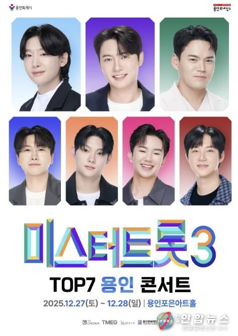 전국연합뉴스 박남호 기자 | 용인문화재단은 오는 12월 27일부터 28일까지 용인포은아트홀에서 ‘미스터트롯3 TOP7 콘서트’를 선보인다. 공연은 27일 오후 1시·6시, 28일 오후 1시 총 3회 진행된다.
