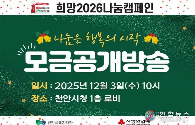 전국연합뉴스 김대환 기자 | (재)천안시복지재단은 내달 3일 희망2026나눔캠페인 공개모금행사 ‘나눔으로 하나되는 따뜻한 천안’을 연다고 28일 밝혔다.