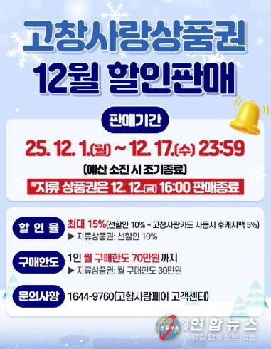 전국연합뉴스 김현호 기자 | 고창군이 연말 지역 소비 촉진과 소상공인 매출 증대를 위해 12월 고창사랑상품권을 최대 15% 할인율로 판매한다고 1일 밝혔다.