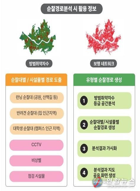 시민 순찰대의 ‘최적 순찰 경로’가 생성되는 과정을 소개한다. CCTV, 보안등, 비상벨 등 방범 시설물 현황과 각종 치안 데이터를 분석해 순찰 필요 지역을 도출하고, 이를 기반으로 맞춤형 순찰 경로를 제공하는 서울형 치안 체계를 설명한다.