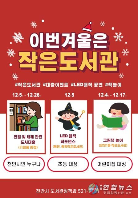 전국연합뉴스 김대환 기자 | 천안시는 연말을 맞아 공립작은도서관에서 다채로운 독서문화 행사를 운영한다고 4일 밝혔다.