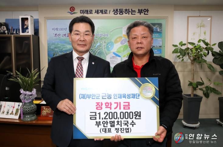 전국연합뉴스 김현호 기자 | 부안멸치국수는 지난 4일 부안군근농인재육성재단에 지역인재 육성을 위한 장학금 120만원을 기탁했다.