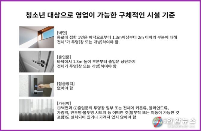 이처럼 청소년유해업소를 밀실 형태로 운영하면서 청소년 출입·고용금지 표시를 하지 않고 영업할 경우에는'청소년보호법'제29조에 따라 2년 이하의 징역 또는 2천만 원 이하의 벌금 처벌을 받게 된다.