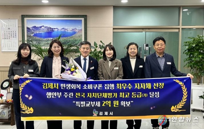 전국연합뉴스 김현호 기자 | 김제시는 243개 전국 자치단체를 대상으로 하는 행정안전부의 「민생회복 소비쿠폰」 집행 평가에서 기초 시(市) 부문 최고등급인 가등급을 획득하며 특별교부세 2억원을 확보했다고 밝혔다.