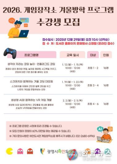 전국연합뉴스 조민준 기자 | 광명시 게임창작소는 오는 29일 오전 10시부터 겨울방학 프로그램 수강생을 모집한다.