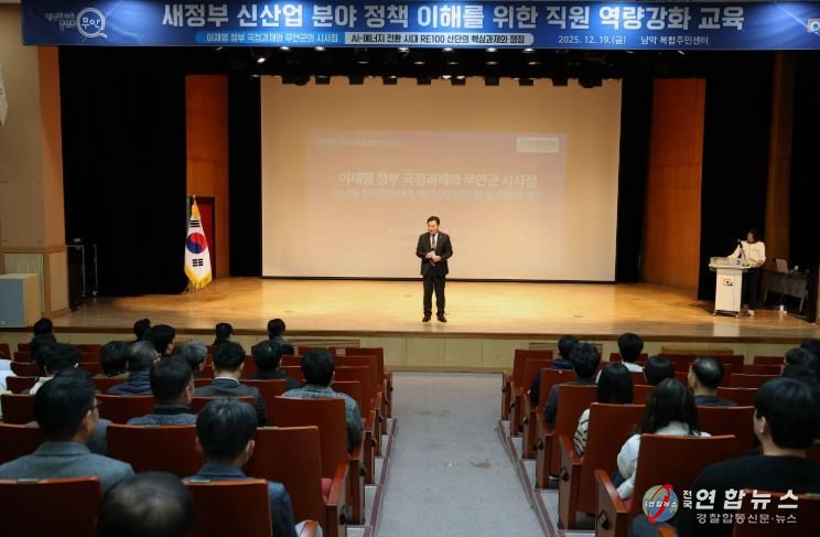 전국연합뉴스 김철환 기자 | 무안군은 지난 19일 남악 복합주민센터 대강당에서 이재명 정부가 국가 신성장 동력으로 육성하고 있는 에너지, AI 등 신산업 분야에 대한 정부 국정과제와 최근 정책 동향에 대한 이해도를 높이기 위해 무안군 공직자들을 대상으로 역량 강화 교육을 실시했다.
