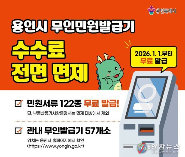 전국연합뉴스 박남호 기자 | 용인특례시는 2026년 1월 1일부터 지역 내 설치된 무인민원발급기에서 발급되는 민원서류 수수료를 전면 면제한다고 25일 밝혔다.