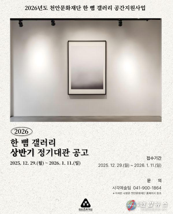 전국연합뉴스 김대환 기자 | 천안문화재단은 오는 29일부터 내년 1월 11일까지 한 뼘 갤러리 공간지원사업 상반기 정기대관 공모 접수를 시작한다고 26일 밝혔다.