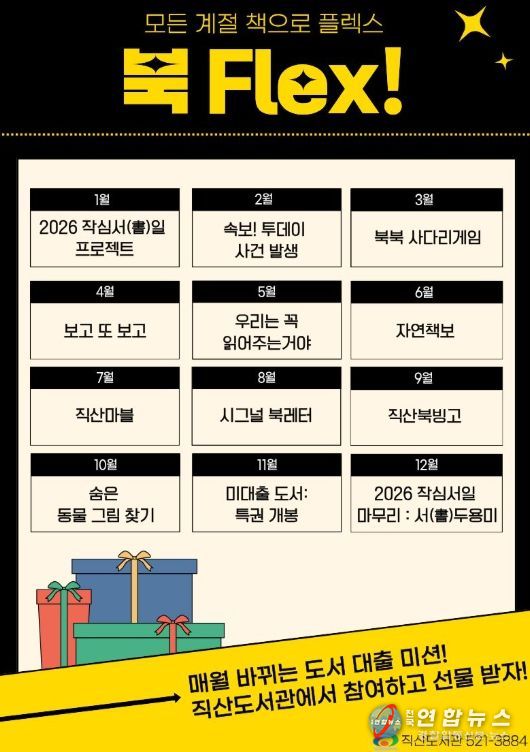 전국연합뉴스 김대환 기자 | 천안시 직산도서관은 내년부터 월별 독서장려프로그램 ‘북 플렉스(Flex)’를 운영한다고 31일 밝혔다.