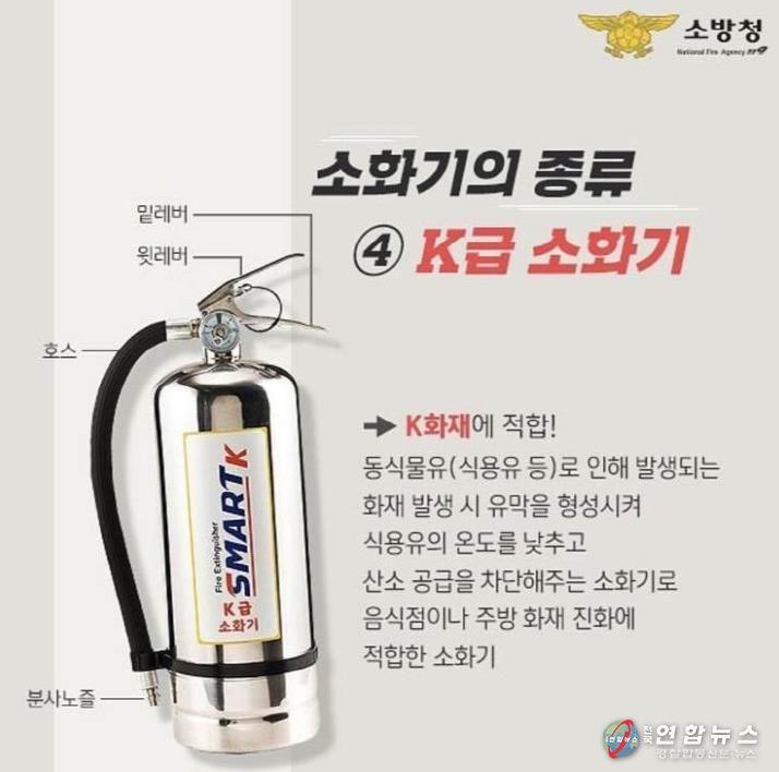전국연합뉴스 김대환 기자 | 천안서북소방서는 음식점과 가정 주방에서 발생할 수 있는 화재를 예방하기 위해 K급 소화기 비치와 올바른 사용을 시민들에게 당부했다.