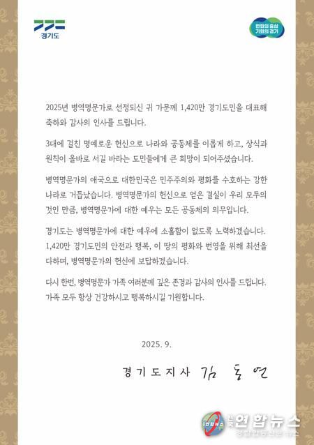 김동연 경기도지사는 서한문을 통해 “병역명문가의 애국으로 대한민국은 민주주의와 평화를 수호하는 강한 나라로 거듭났다”면서 “경기도는 병역명문가에 대한 예우에 소홀함이 없도록 노력하겠으며, 헌신에 보답하겠다”고 감사와 존경의 뜻을 표현했다.