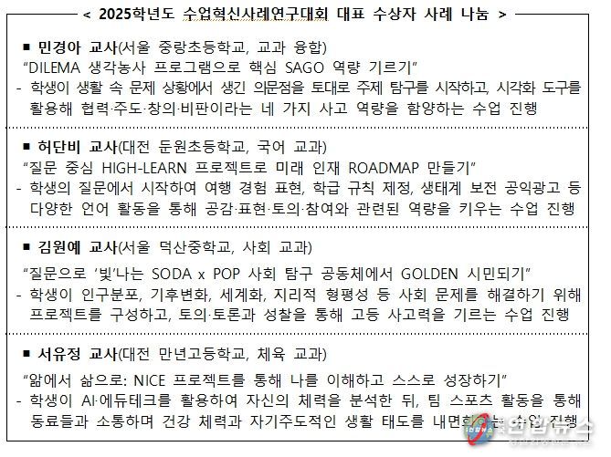전국연합뉴스 기자 | 교육부와 한국교육과정평가원(원장 직무대리 박은아)은 1월 7일, 엘타워(서울)에서 수상자와 교육청 관계자 등이 참석한 가운데 ‘2025학년도 수업혁신사례연구대회 시상식’을 개최한다.