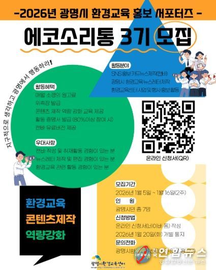 전국연합뉴스 조민준 기자 | 광명시가 오는 16일까지 시민의 시각에서 지역 환경교육 현안을 생생하게 전달할 홍보 서포터즈 ‘에코소리통 3기’를 모집한다.