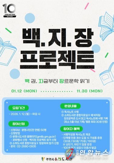 전국연합뉴스 조민준 기자 | 광명시 소하도서관은 오는 12일부터 장르문학 도서 100권 읽기 챌린지인 ‘백.지.장 프로젝트’ 참여자를 모집한다.