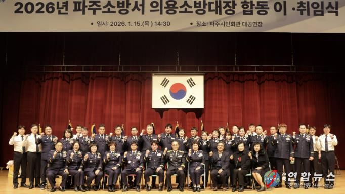 전국연합뉴스 박충곤 기자 | 파주소방서는 1월 15일 파주시민회관 대공연장에서 『2026년 파주소방서 의용소방대 대장 합동 이·취임식』을 열고, 지역 안전을 위해 헌신해온 이임 대장들의 공로에 감사를 전하는 한편, 새로운 리더들과 함께 ‘의용’의 사명을 이어갈 뜻을 다졌다.